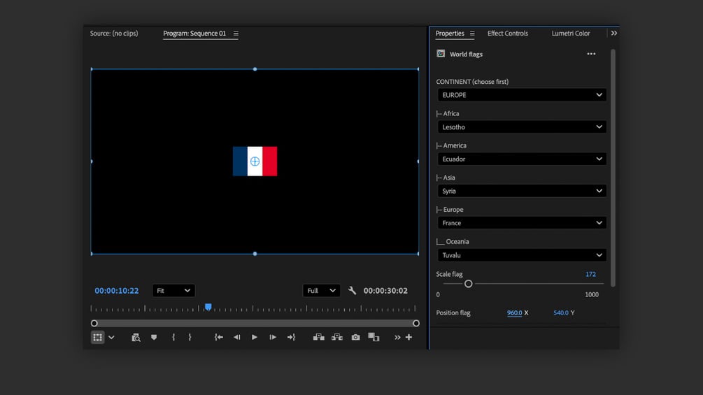 Select among 202 country flags directly inside Premiere and After Effects. 1 AEP file, 6 MOGRT files.